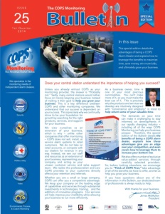 Fire PERS 2-Way Security Video Environmental, Process, & Custom Monitoring We specialize in the monitoring needs of independent alarm dealers. Unless you already entrust COPS as your monitoring provider, the answer is “Probably not.” Sadly, many central stations would rather focus on merely keeping your business instead of making it their goal to help you grow your business . This is a key difference between COPS and other monitoring companies: We understand that our success is dependent on your success. This is precisely why we continually strive to be your foundation for growth by searching for the right products, services, and support for your business. We view ourselves as an extension of your business, which is why – unlike other companies that offer monitoring – COPS does not sell, install, or service alarm systems to retail customers. We do not take on retail accounts, or compete with our dealers for revenue in any way. Instead, we see our staff and resources as an extension of your business, representing your company and acting as your unseen customer service and sales support team. We realize the professionalism and care COPS provides to your customers directly affects your retention and referrals. Whether you are a small or large company, COPS can offer you a competitive advantage. We keep your company on the leading edge of capabilities and services through substantial investments in technologies, training, and the addition of innovative programs. Our services will help improve your credibility while allowing your business to run more efficiently. As a business owner, time is one of your most precious commodities. You can’t make more of it, so you must make the best use of it. This is precisely why the products and services we develop are intuitively designed with “convenience and simplicity” in mind to help return some of your valuable time. The demands on your time can make it challenging to stay informed on developments in our rapidly changing industry – including all of the ways COPS Monitoring can help your business prosper. Therefore, this special edition of the Bulletin details the benefits of being a COPS alarm dealer, explains how these advantages give you an edge over your competition, and even covers how to leverage them to increase your bottom line . Wealsoofferanumberofexclusive value-added services through carefully selected providers. So, before looking elsewhere, we encourage you to “Think of COPS First,” take advantage of all of the benefits we have to offer, and let us help you grow your business. If you have questions about any of the information in this Bulletin, our dedicated team of professionals is always ready to help. Bullet n The COPS Monitoring I S S U E 25 1 s t Q u a r t e r 2 0 1 4 In this issue This special edition details the advantages of being a COPS Alarm Dealer and explains how to leverage the benefits to maximize time, save money, win more bids, and ultimately grow your business. Does your central station understand the importance of helping you succeed? James McMullen President With thanks for your business,
